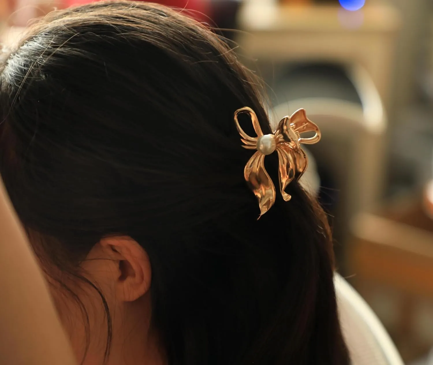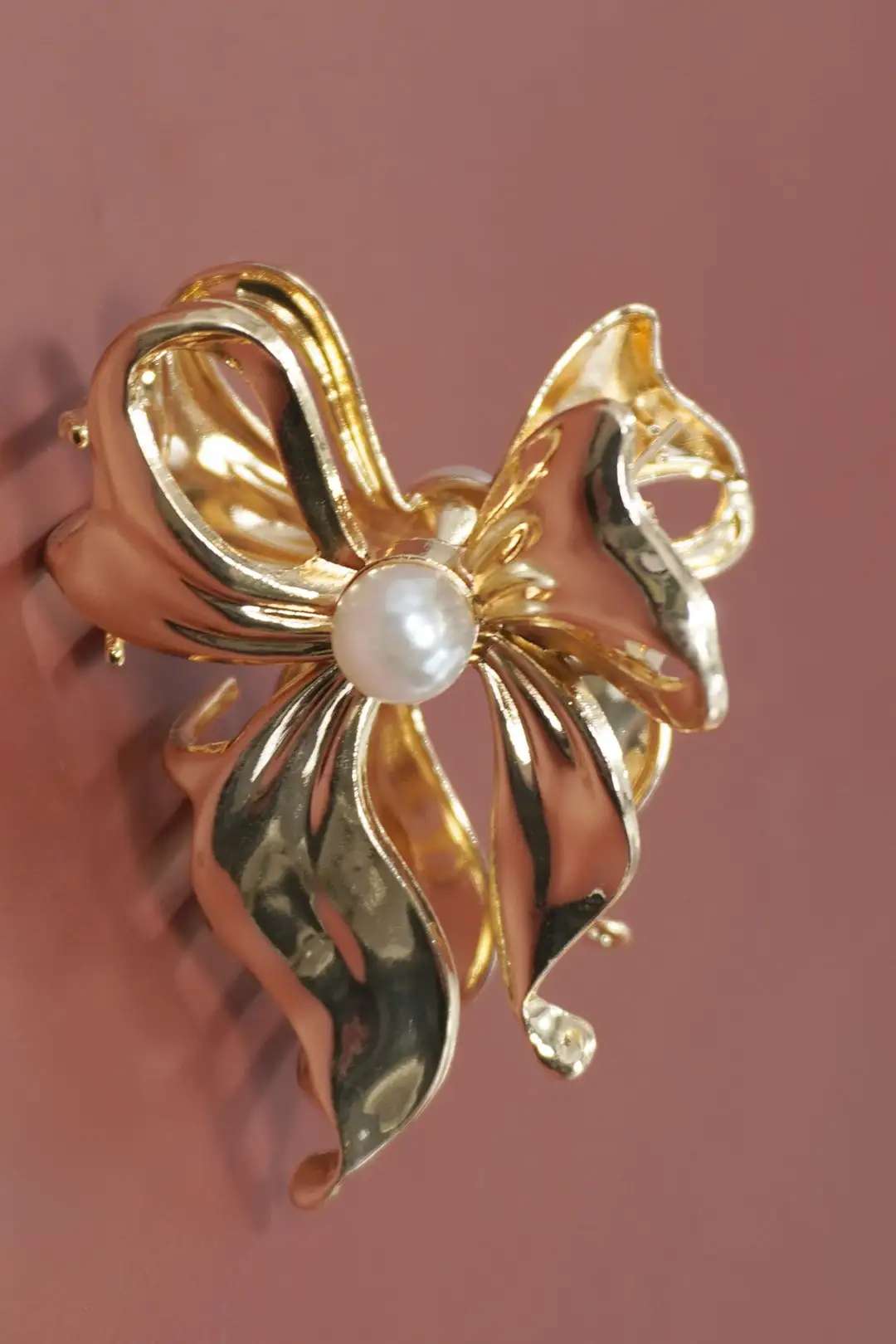 Add a touch of timeless elegance to your look with our Golden Metal Pearl Bow Hair Claw Clip. This stylish accessory features a chic metallic golden bow design adorned with a stunning pearl detail at the center, perfectly blending classic and trendy elements.